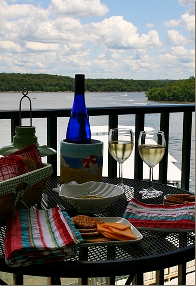 The perfectly chilled wine is Steinberg White, from Stone Hill Winery, Hermann, Missouri. We added seasoned oil for dipping the bread and a few crackers with cheese, for a delightful lunch on the deck, Sunday.